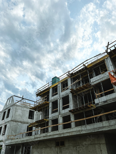 Low angle shot of a construction site with half-build structure. Process of building concrete apartment house. Concept of investing and mortgaging in the stage of home building