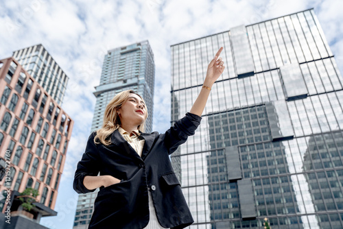 Low angle view of a smiling professional woman in a cityscape, reaching out with confidence. A powerful representation of success, determination, and urban professional lifestyle.