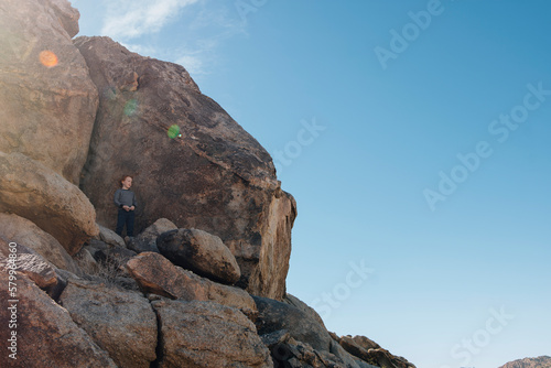 boy, standing, rock, sky, summer, nature, adventure, scenic, exploration, carefree, oceanside, remote, copy space, calmness, california, casual clothes, get-away, environment, recreation, us, landscape, sunlight, front view, lifestyle, avocation, childhood, outdoors, day, one person, male