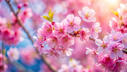 Low angle view of pink cherry blossom trees with blurred flowers in spring background