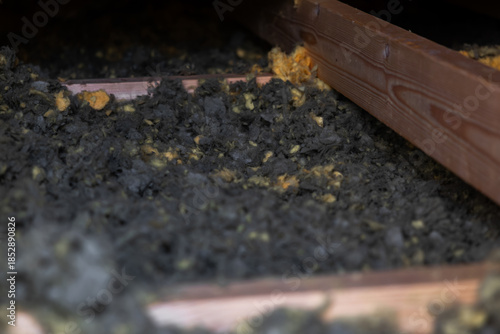 attic, insulation, roof, wooden, fiber, cellulose, mineral, wool, timber, homeowner, inspector, maintenance, repair, energy, efficiency, residential, house, home, building, structure, slope, aged, old, condition, replaced, thermal, layer, daylight, light, soft, directional, depth, field, rough, smooth, yellow, piece, view, project, work, inspection, saving, cost, warmth, cold, heat