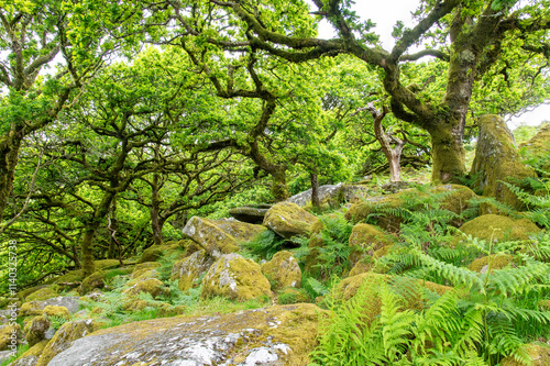 Low angle view under the canopy of green trees in Wistman's Wood, an ancient temperate rainforests and high-altitude oakwood in Dartmoor National Park, Devon, UK with large moss-covered rocks