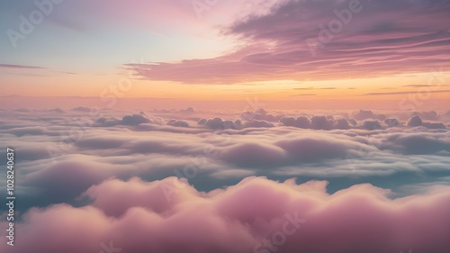 Low clouds lingering near the horizon at dawn, with the sky glowing in pastel shades of yellow, pink, and blue, creating a calming atmosphere