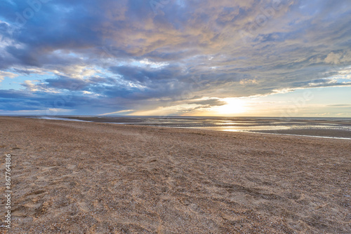 Low clouds over a Old Hunstanton beach at sunset