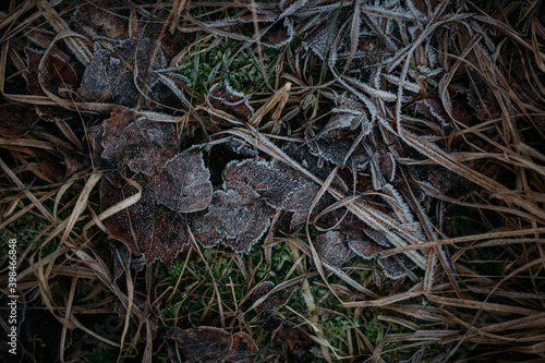 low key still life of Frozen leaves in winter on the ground