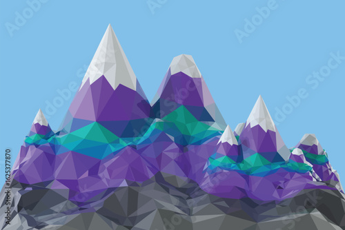 Low poly mountains with snow capped peaks and a blue sky background in a stylized digital rendering
