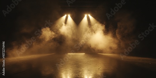 Low-angle cinematic shot of swirling smoke on dark stage, converging spotlights creating light columns, deep shadows, polished stage floor reflections