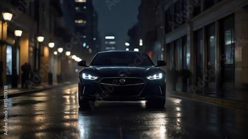 Low-Angle Close-Up of a Sleek Modern Black Car on a Wet Night Road with Bokeh Lights