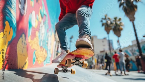 skateboarding, skater, leg, foot, shoe, board, trick, graffiti, wall, art, urban, city, park, sun, day, summer, activity, sport, extreme, action, movement, style, fashion, youth, young, person, male, jean, casual attire, wheel, ramp, ground, asphalt, background, people, crowd, fun, energy, lifestyle, recreation, hobby, skill, balance, adventure, freedom, thrill