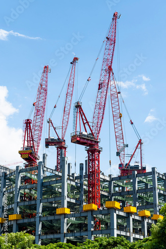 Low-angle view of cranes and steel structures of building construction with a blue sky background in Taiwan.