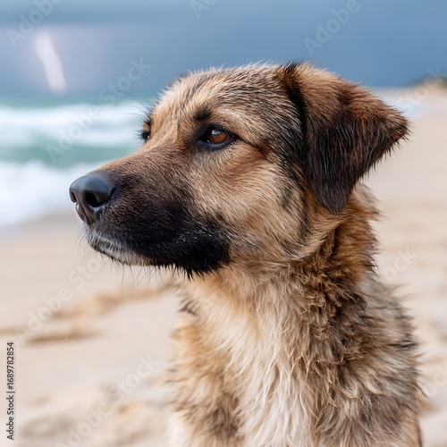 dog, beach, storm, lightning, animal, pet, nature, sand, ocean, sea, weather, sky, landscape, portrait, fur, loyalty, expression, calm, peaceful, shoreline, day, outdoors, scenic, mammal, gold, wet, cute, happy, domestic, wildlife, beauty, beachside, tranquil, companion, eye, closeup, love, freedom, adventure, stormy, horizon, summer, playful, friendly, bark, companionship, joy