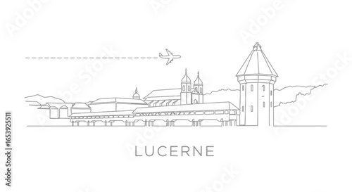 lucerne, switzerland, skyline, city, travel, tour tourism, architecture, landmark, vector, illustration, line art, outline, minimal, city landscape, europa, european, swiss, plane, aeroplane, flying, bridge, water tower, mountain, alps, famous, destination, journey, voyage, trip, graphic, design, background, white, icon, symbol, modern, simple, elegant, monochrome, drawing, linear, travel destination