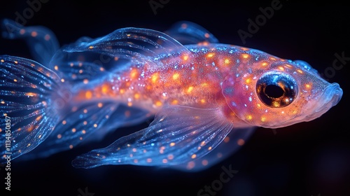 fish, underwater, ocean, aquatic, marin, life, wildlife, nature, animal, creature, glowing, transparent, scale, fin, tail, eye, body, water, dark, night, macro, photo, closeup, detail, specimen, bright, colours, blue, orange, red, light, beauty, wonder, mystery, illuminated, iridescent, vibrant, exotic, rare, unique