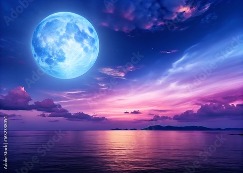 Luminous Blue Moon Illuminates a Vibrant Twilight Sky Over a Calm Ocean night