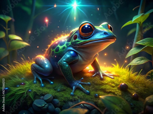 Luminous Green Frog on Mossy Rock Glowing Night Scene Amphibian Fantasy