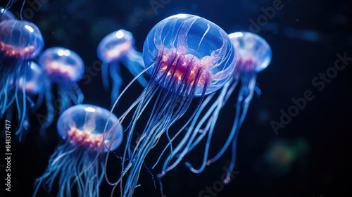 Luminous jellyfish swim deep in the blue sea jellyfish neon jellyfish fantasy water long strings.