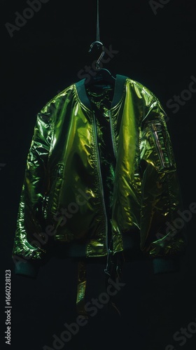 jacket, green, luminescent, clothing, fashion, style, apparel, dark, background, texture, material, shiny, reflective, light, shadow, contrast, design, detail, closeup, photo, image, photo, studio, lighting, display, product, isolated, darkroom, black, hanging, draped, accessory, silhouette, garment