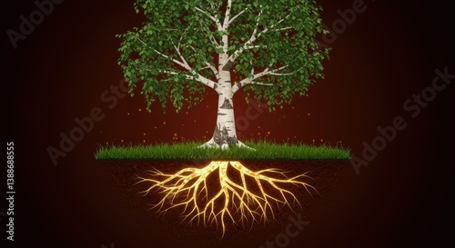 tree, birch, root, glowing, ground, grass, dirtied, nature, plant, life, growth, energy, illuminated, dark, background, three-dimensional, render, digital, art, illustration, realistic, environment, ecology, timberland, flora, botanical, bright, gold, earth, vibrant, visual, graphic, image, design, aesthetic, creation, artistic, composition, model, scene, rendering