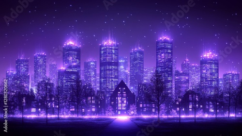 Luminous urban skyline in ultramodern violet with twinkling stars and blurred foreground creating a futuristic ambiance