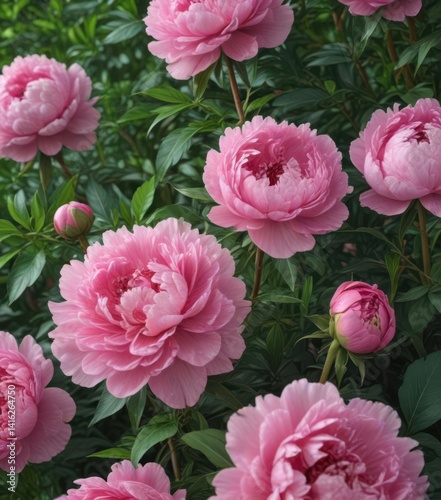 Luscious pink peonies, lush green foliage Close-up view , petals, pink