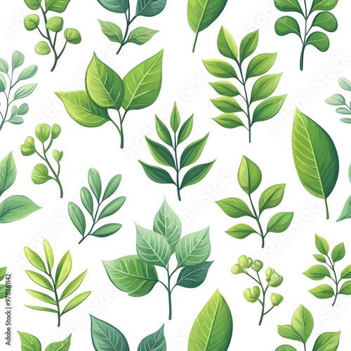 Lush and Vibrant Seamless Pattern with Diverse Leaves on White Background