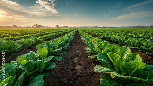 cabbage, field, row, horizon, morning, cultivated, land, agriculture, crop, farmland, farm, green, plant, landscape, rural, nature, vegetable, growth, food, healthy, sunrise, sky, outdoors, perspective, earth, dirtied, growing, agronomy, produce, harvest, leaf, head, plantation, row, countryside, nobody, sunny, sunlight, dietary, fiber