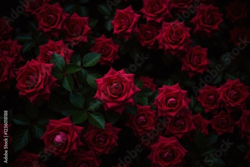lush cluster of red roses and leaves against dark background