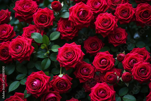 lush dense cluster of red roses and foliage in various bloom stages