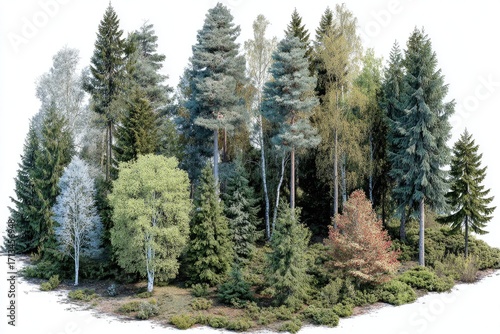tree, forest, timberland, conifer, deciduous, birch, pine, spruce, fir, greenery, nature, landscape, foliage, vegetation, flora, ecology, environment, botanical, wood, plant, scenic, vibrant, colourful, assorted, diverse, mixed, flocked, group, collection, clump, hill, mound, elevated, isolated, background, white, image, digital, rendering, three-dimensional, model, artwork, illustration, natural, view, scene