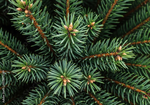 Lush Evergreen Pine Needles Detail. Detailed shot of vibrant green coniferous foliage, showcasing intricate natural patterns and small budding cones. Represents vitality, enduring nature, and the.