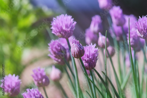 Lush flowering chives with purple buds in the garden. Wild Chives flower or Flowering Onion, Allium Schoenoprasum , Chinese Chives, Schnittlauch, Garlic Chives. Shallow depth of field