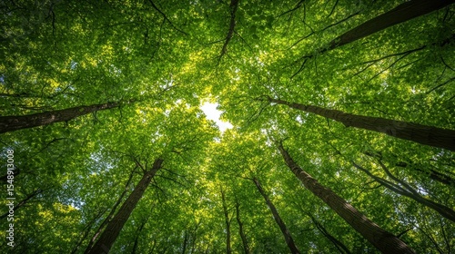 forest, tree, nature, green, leaf, environment, sunlight, sky, daylight, timberland, natural light, landscape, foliage, green tree, fresh, freshness, lush, dense, beauty, calm, peaceful, forest floor, natural, treetop, green tree, nature scene, fresh air