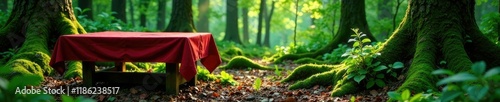 Lush forest floor with a wooden table and red tablecloth, forest floor, moss