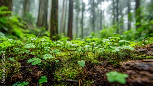 Lush Forest Floor with Moss, Clover, and Dew Drops in a Pacific Northwest Forest