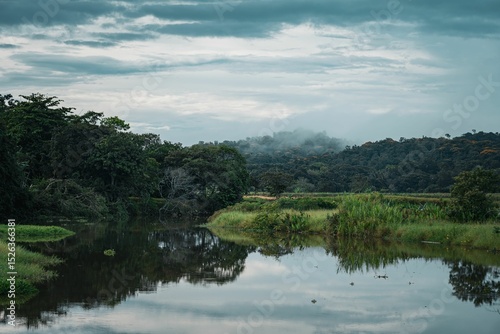 landscape, forest, river, calm, serene, lush, green, nature, cloudy, sky, water, calmness, peaceful, scenic, outdoors, environment, natural, wilderness, vegetation, tree, foliage, scenery, ecosystem, habitat, wetland, jungle, tropical, mist