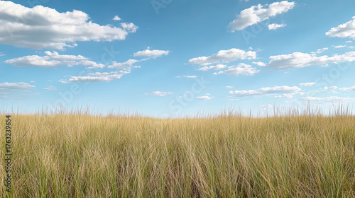 grass, plain, blue skies, cloud, serene, calm, nature, landscape, calmness, open space, horizon, summer, field, sunlight, beauty, environment, rural, peaceful, scenery, natural, vibrant, gold, sky, fluffy, expansive, bright, clear, sunny