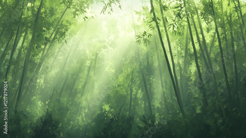 Lush Green Bamboo Forest with Sunlight Streaming Through