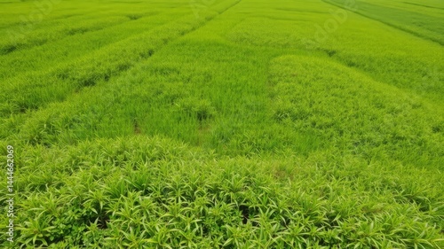 Lush green field of vibrant rice paddy plants viewed from an elevated angle showcasing the texture and patterns of the crop.