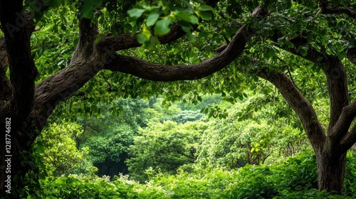 Lush Green Forest Scene Framed by Trees in Bright Natural Light