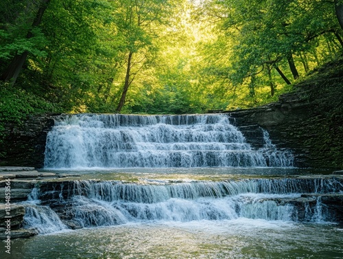 waterfall, forest, cascade, nature, water, river, creek, rock, stream, flora, sunlight, greenery, landscape, calmness, environment, scenic, summer, peaceful, river bank, travel, adventure, beauty, natural, serenity, freshness, moss, wildlife, photo, hiking, scenic view, natural light, lush, wilderness, foliage, rejuvenation, cool, calm, flowing water, crystal-clear, vibrant, idylli, meandering