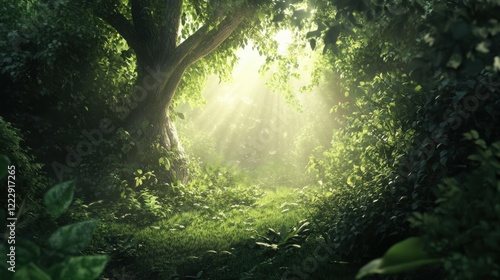 lush green forest with sunlight streaming through leaves