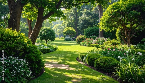 garden, landscape, path, green, tree, flower, nature, park, grass, pathway, sunlight, summer, scenic, plant, foliage, lawn, bush, blossom, floral, spring, environment, tranquil, peaceful, idylli, botanical, yard, landscaping, fresh, growth, bloom, natural, daylight, bright, scene, season, rural, countryside, beauty, calm, light