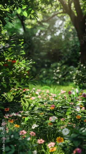 Lush green garden with a variety of blooming flowers, 4K hyperrealistic photo