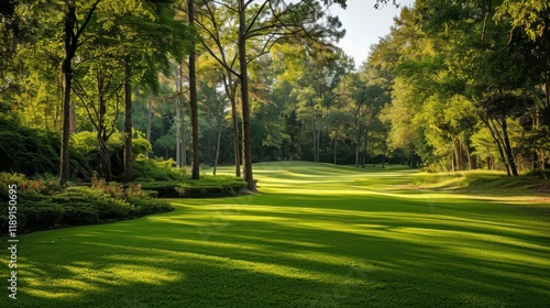 Lush Green Golf Course Fairway Surrounded by Tall Trees and Soft Shadows in a Serene Natural Landscape on a Sunny Day
