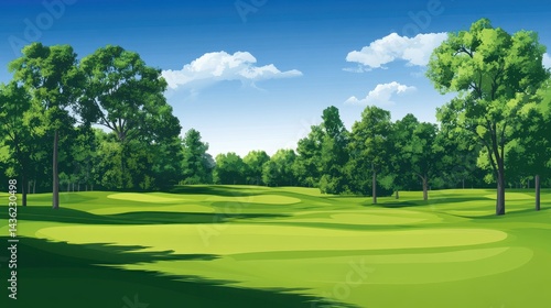 golf, course, green, tree, sky, landscape, nature, sport, recreation, grass, fairway, calmness, leisure, scenery, summer, sunlight, relaxation, activity, park, environment, open, field, beauty, peaceful, horizon, vibrant, scenic, blue, fresh, healthy, play, sunny, natural, view, ground, expansive, idylli, lush, bright, picturesque, atmosphere, enjoyment, wellness, exercise, adventure, exploration, fun, escape