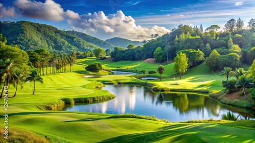 Lush green golf course with rolling hills and sparkling water features in Phuket Thailand, phuket