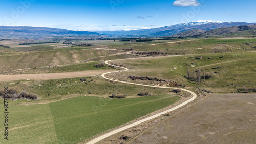 grass, road, mountain, field, hill, landscape, sky, vale, outdoors, nature, countryside, farm, pasture, meadow, ranch, mountain chain, travel, agriculture, aerial view, plain, grazing, dirt road, gravel, turf, blue, clear sky, road trip, journey, rural scene, country road, drone, farm animal, farmer, travel destination