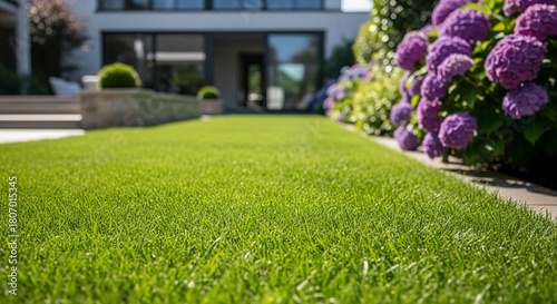Lush green grass lawn extends toward a modern house with purple hydrangea flower bush, showcasing a well-maintained garden and landscape design