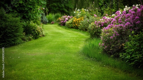 Lush green grass pathway winding through vibrant garden blooming with colorful flowers