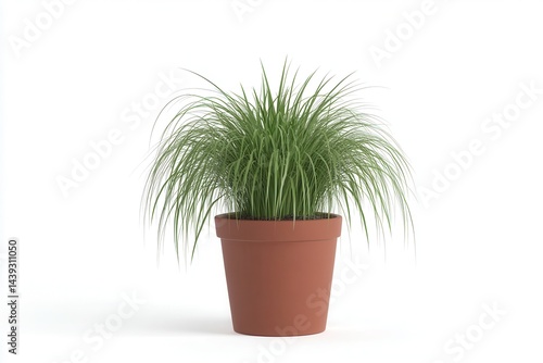 Lush green grass plant in a simple terracotta pot against a clean white background